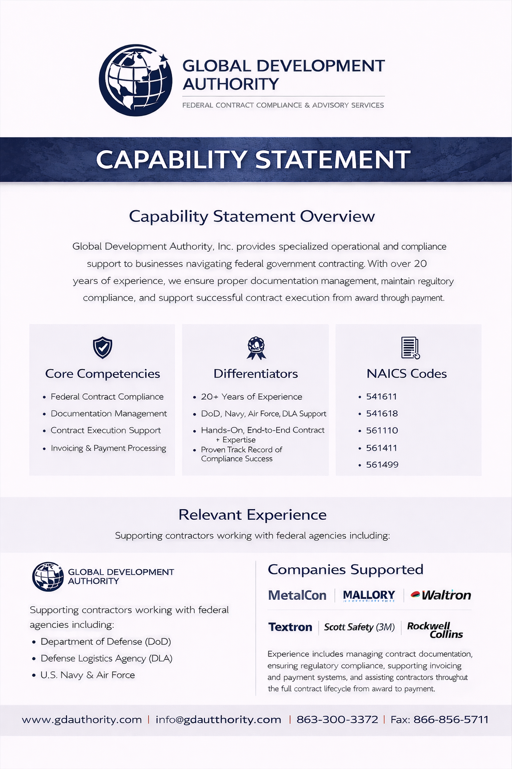 Global Development Authority, Inc. provides specialized operational and compliance support to businesses navigating federal government contracting. With over 20 years of experience, we assist contractors in managing documentation, ensuring compliance, and successfully executing contracts from award through payment.